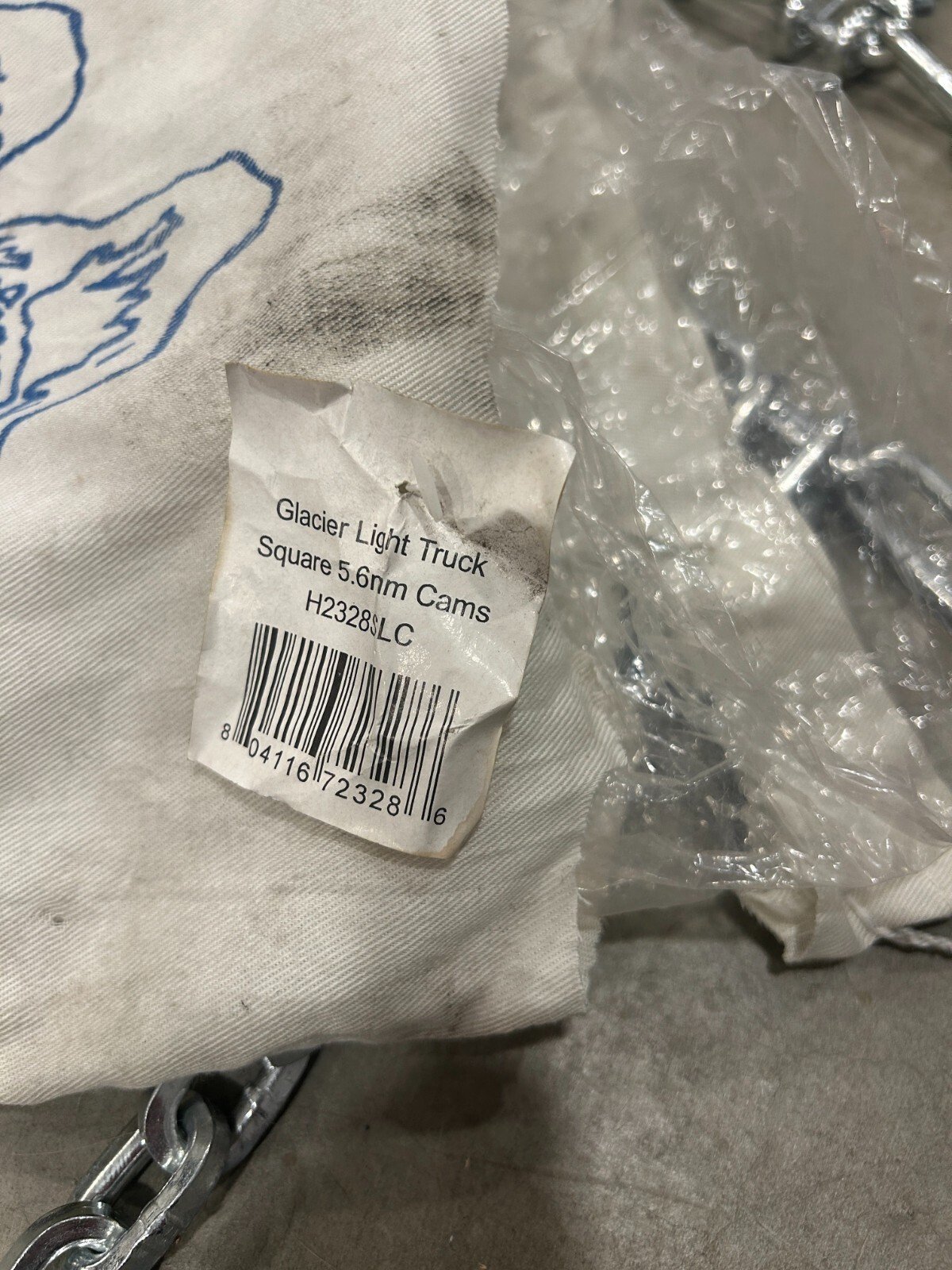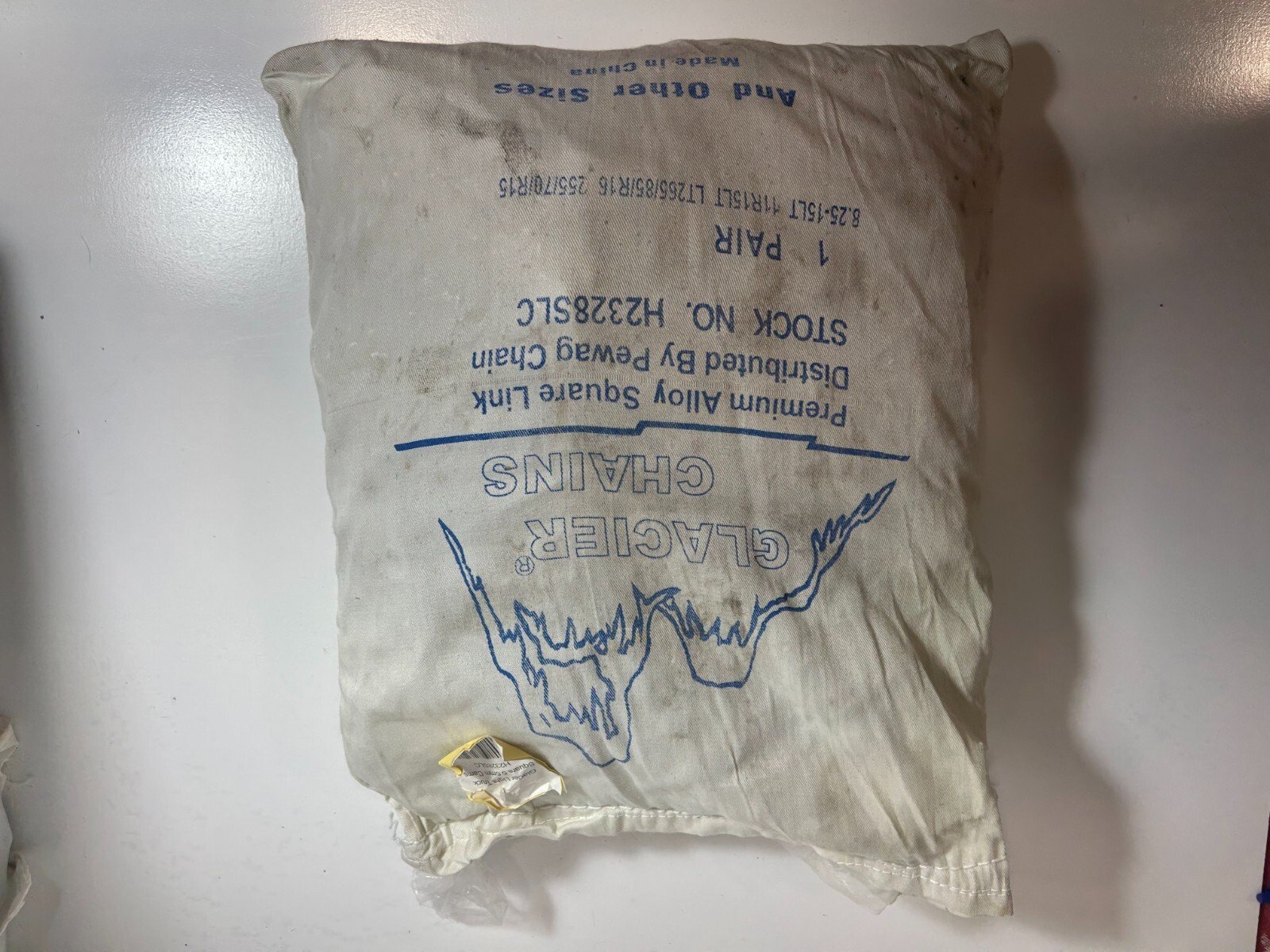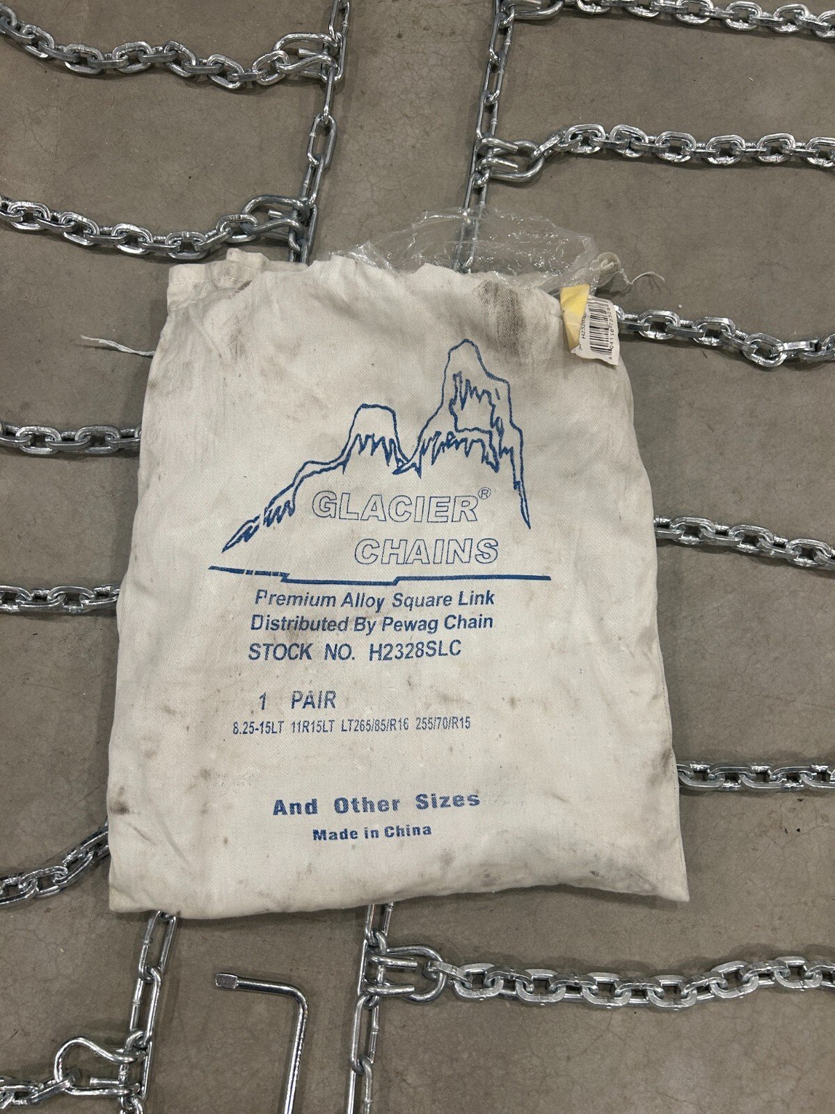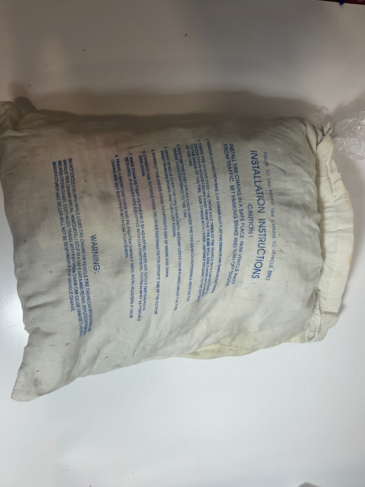 These are brand new, unopened Glacier Chains tire chains, model H2328LC. They are New Old Stock (NOS), meaning they are unused items that have been stored for a period of time. While the chains themselves are in excellent, unused condition, please note that the original packaging bags are somewhat dirty and may have small holes due to storage. The max chain length is 82 inches and width is  15 inches.